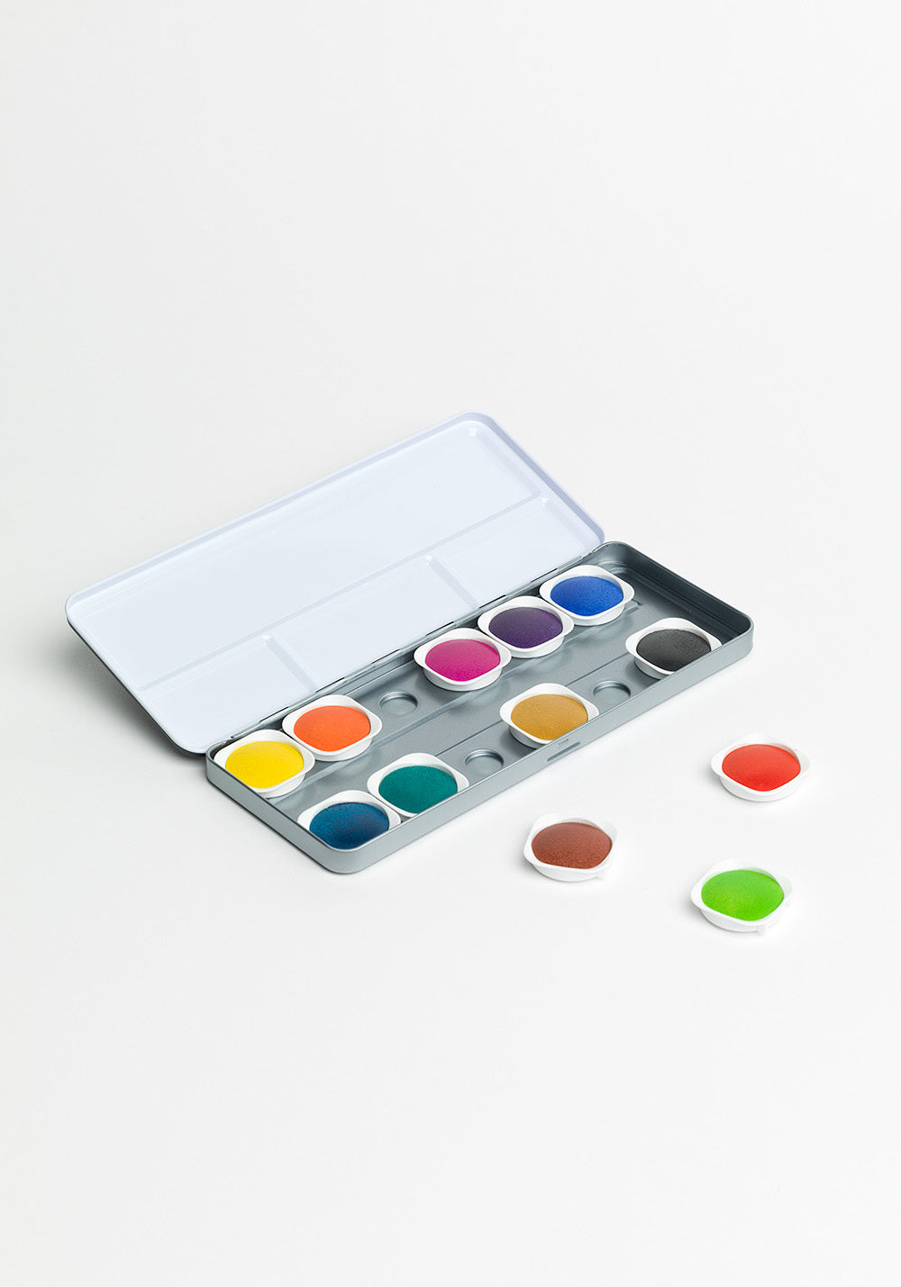 Vårt eget akvarellset med 12 kulörer i metallask. Färgerna är transparenta och innehåller mycket pigment för att ge klara, vackra färger. Färgkakorna är löstagbara och går därför att sätta i vilken ordning man vill, i locket på asken finns blandytor för att spä ut och blanda färgerna.