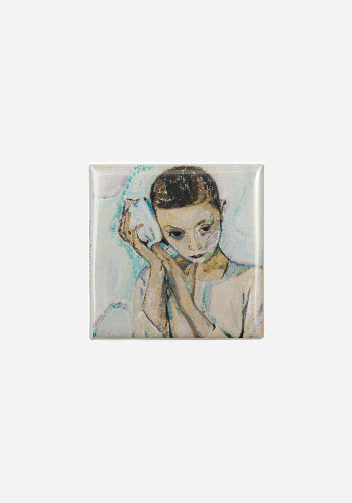 Fyrkantig magnet med motiv av Tora Vega Holmströms målning Gosse med snäcka från 1918 som finns i Moderna Museets samling.